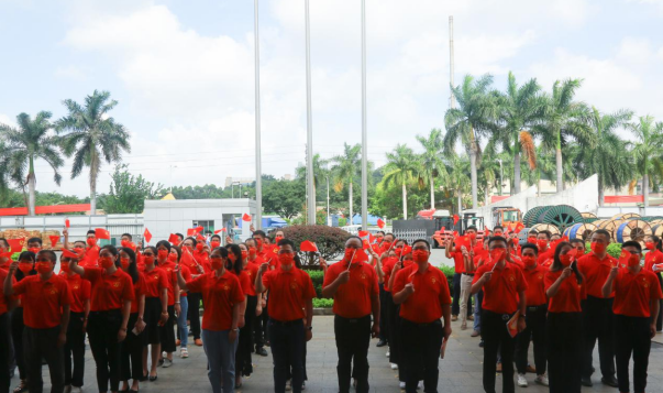 盛夏七月,热情似火!bifa必发公司已是党旗飘扬,处处洋溢着喜庆祥和的气氛。当日上午,身穿“中国红”T恤的党员等参会人员有序入场,列队数字“100”庆祝图案,表达对中国共产党的无限热爱。随着主持人一声令下,伴随着激昂雄壮的国歌声,护旗手奋力将鲜艳的五星红旗抛向天空,国旗迎着清晨第一缕阳光冉冉升起,全体人员庄重注视国旗,高唱国歌,脸上写满了骄傲与自豪。